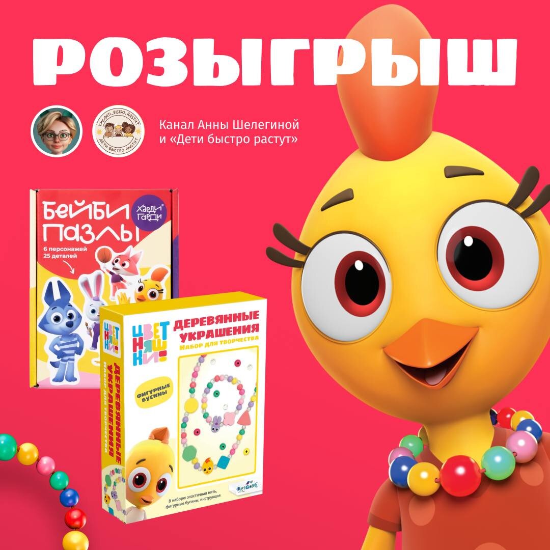 Для тех малышей, которые знают, что Цветняшки — это красочно, музыкально, познавательно и весело и тех, которые ещё не знакомы с Цыплёнком Пи, Волчонком У, Котёнком Мур и другими персонажами музыкального развивающего сериала для малышей, мы запускаем розыгрыш с каналами «Дети быстро растут», «Цветняшки» и Анной Шелегиной, автором и сценаристом мультсериала. Победители розыгрыша получат: 🥇— бейби-пазлы 🥈— набор для творчества, фигурные бусины Условия очень простые: быть подписанным на наши каналы: 💫 Цветняшки 💫 Анна Шелегина 💫 Дети быстро растут 🖇️ нажать кнопку «Участвую» Победитель будет выбран ботом 10 апреля в 18:00 МСК 🕒 Пусть вам повезёт! 🤍