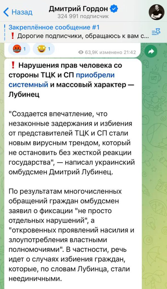 Журналист неоднократно поднимал в своем телеграм-канале проблему беспредела ТЦК. На днях он процитировал украинского омбудсмена Дмитрия Лубинца о том, что вседозволенность ТЦКашников перешла все границы и приняла массовый характер.