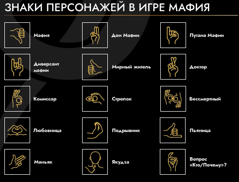 Диверсант Мафии - В первую ночь знакомства обозначает себя показав жест диверсанта. Просыпается каждую ночь вместе с Мафией и участвует в выборе цели выстрела. Если в вас ночью кто-то стреляет, то он подрывается и уходит из игры вместе с вами (например Маньяк или Стрелок)