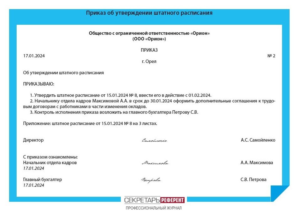Штатное расписание утверждается приказом по основной деятельности. Приводим пример такого приказа.