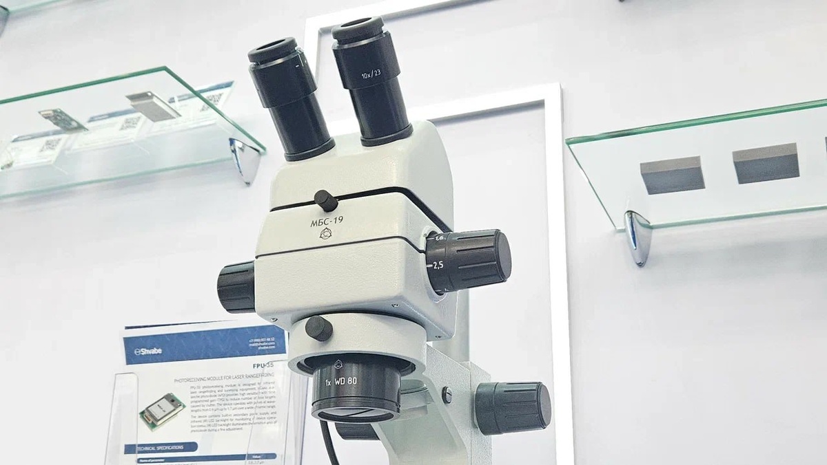 Холдинг «Швабе» (входит в Ростех) представил новый стереоскопический микроскоп МБС-19 с улучшенной оптической схемой. Прибор, разработанный Лыткаринским заводом оптического стекла (ЛЗОС), обеспечивает более контрастное изображение без искажений цвета и геометрии.