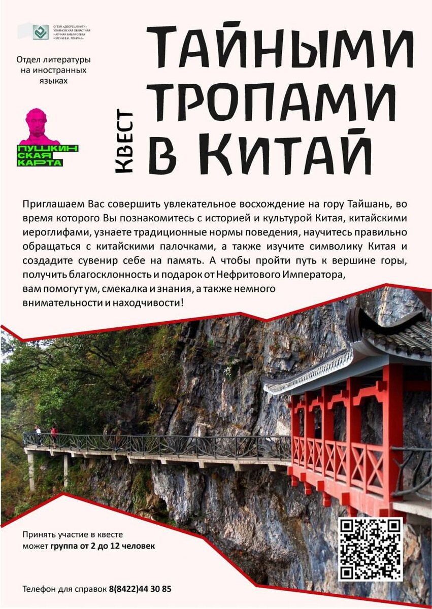 Квест «Тайными тропами в Китай» 🗓️ 13 апреля в 14.00 📍 Дворец Книги, пер. Карамзина, д.3/2 Увлекательное восхождение на гору Тайшань позволит участникам познакомиться с историей и культурой Китая. Пройти путь к вершине горы и получить благосклонность и подарок от Нефритового Императора участникам помогут ум, смекалка и знания, а также немного внимательности и находчивости. Мероприятие рассчитано на группы от 2 до 12 человек, продолжительность 1,5-2 часа, возрастная маркировка 12+, знание китайского языка не требуется. Запись по телефону: 8 (8422) 44-30-85 (отдел литературы на иностранных языках). Билеты 🎟️ #13апреля25