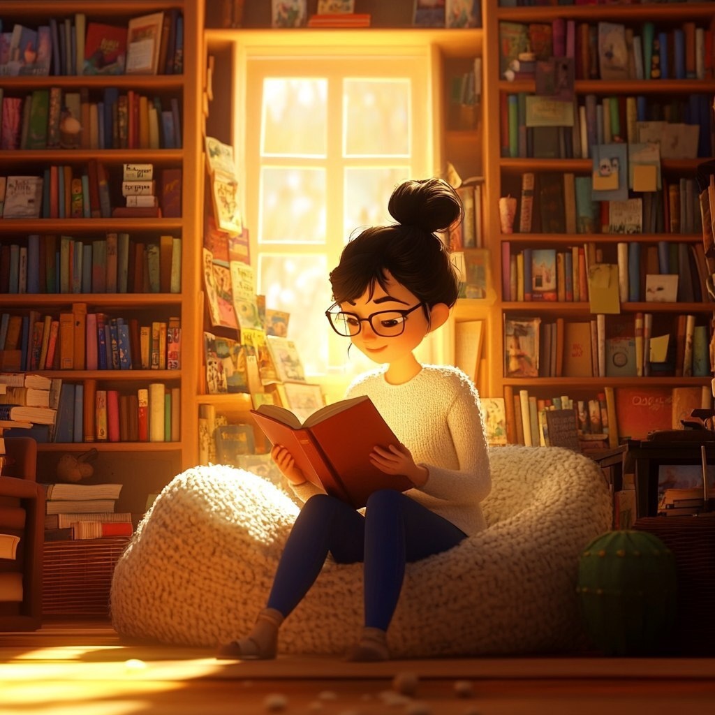 Создано на основе запроса: A thoughtful book club member speaking with insight in a cozy library, Pixar/Disney style