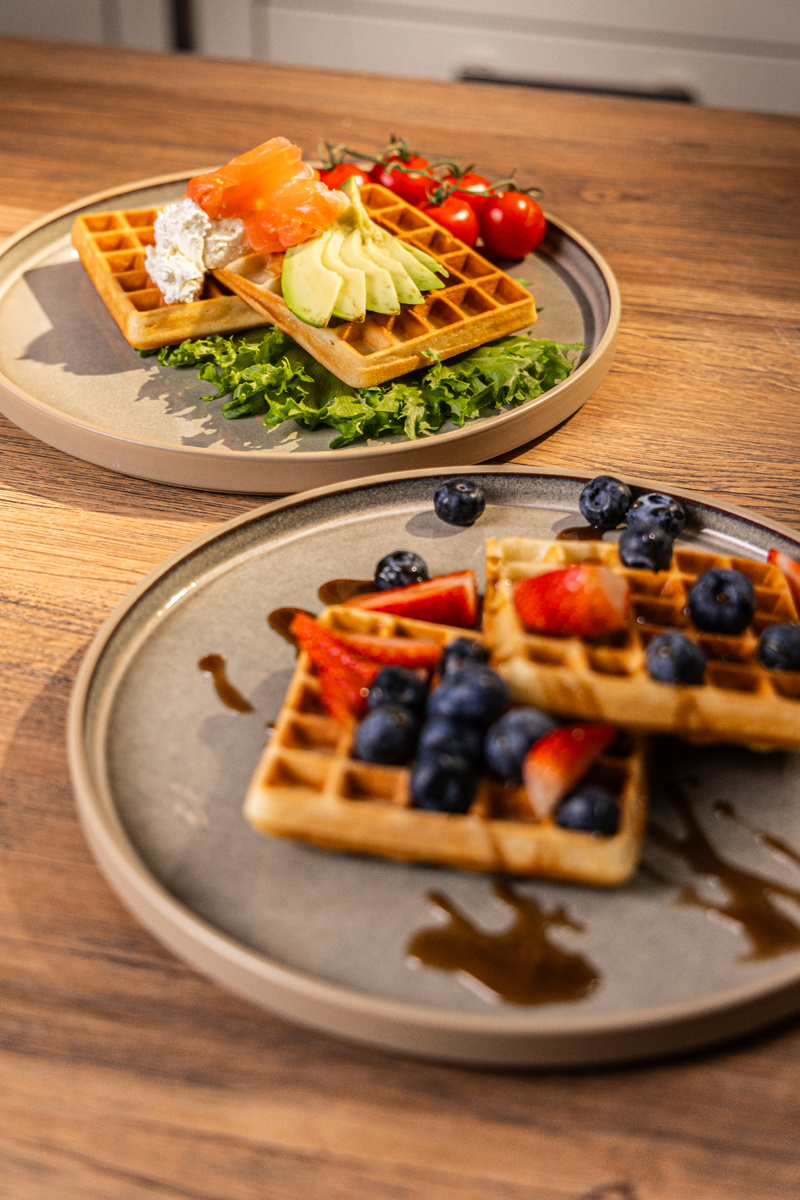 - Подать вафли. Горячие вафли переложить на решётку и остудить. Перед подачей переместить вафли на тарелку, украсить сахарной пудрой, сдобрить джемом, мёдом, сгущёнкой или свежими ягодами.