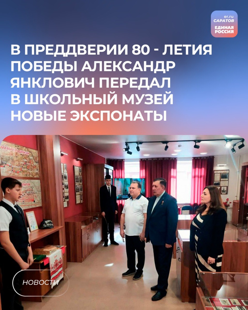 🎖️Депутат, Герой России Александр Янклович вновь посетил школу-интернат «Уникум» и привёз в музей учреждения точные копии орденов и медалей времён Великой Отечественной войны. Решение о таком подарке было принято во время прошлой встречи с педагогами и воспитанниками. Тогда депутату провели экскурсию по музею, основанному ещё в 1965 году и посвящённому 32-ой Саратовской стрелковой дивизии. Янклович решил помочь пополнить коллекцию военными атрибутами. Парламентарий поблагодарил педагогов и руководство интерната за их вклад в сохранение исторической памяти. Он подчеркнул, что такие музеи играют огромную роль в воспитании подрастающего поколения, помогая осознать ценность мирной жизни. 💬«Каждая награда — это символ подвига, стойкости и любви к Родине. Важно не просто знать историю, а чувствовать её сердцем. Наши предки сражались за страну, и долг каждого из нас — сохранить память о них», – сказал Александр Янклович. Герой России призвал ребят интересоваться историей, изучать судь