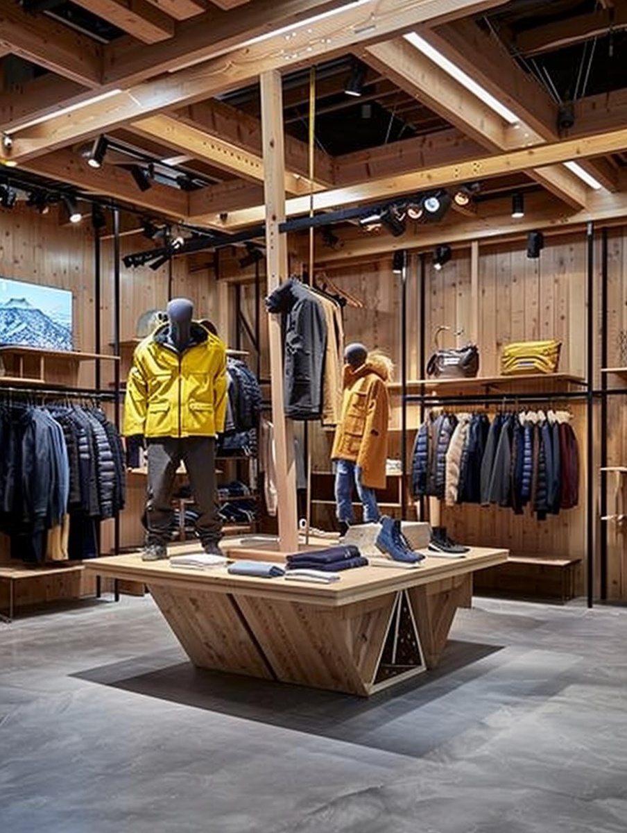Автоперевод: Магазин одежды в матовом металле, винтажный цемент, деревянное зерно, промышленный стиль.
