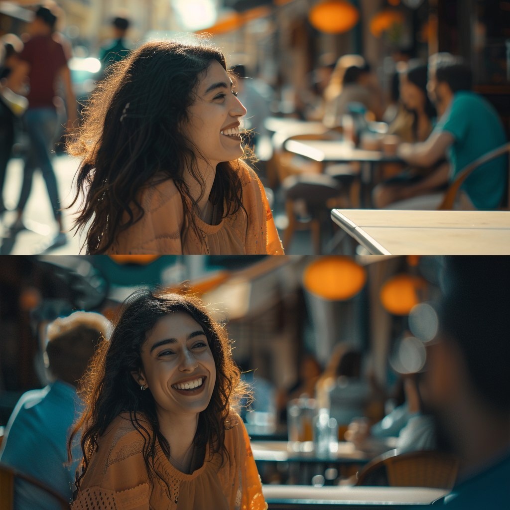 Создано на основе запроса: A woman wearing casual clothes is chatting with friends in a caf é, with a bright smile. The color scheme is bright, with a city street scene as the background, full of vitality. Realistic style, film and television camera, ultra clear