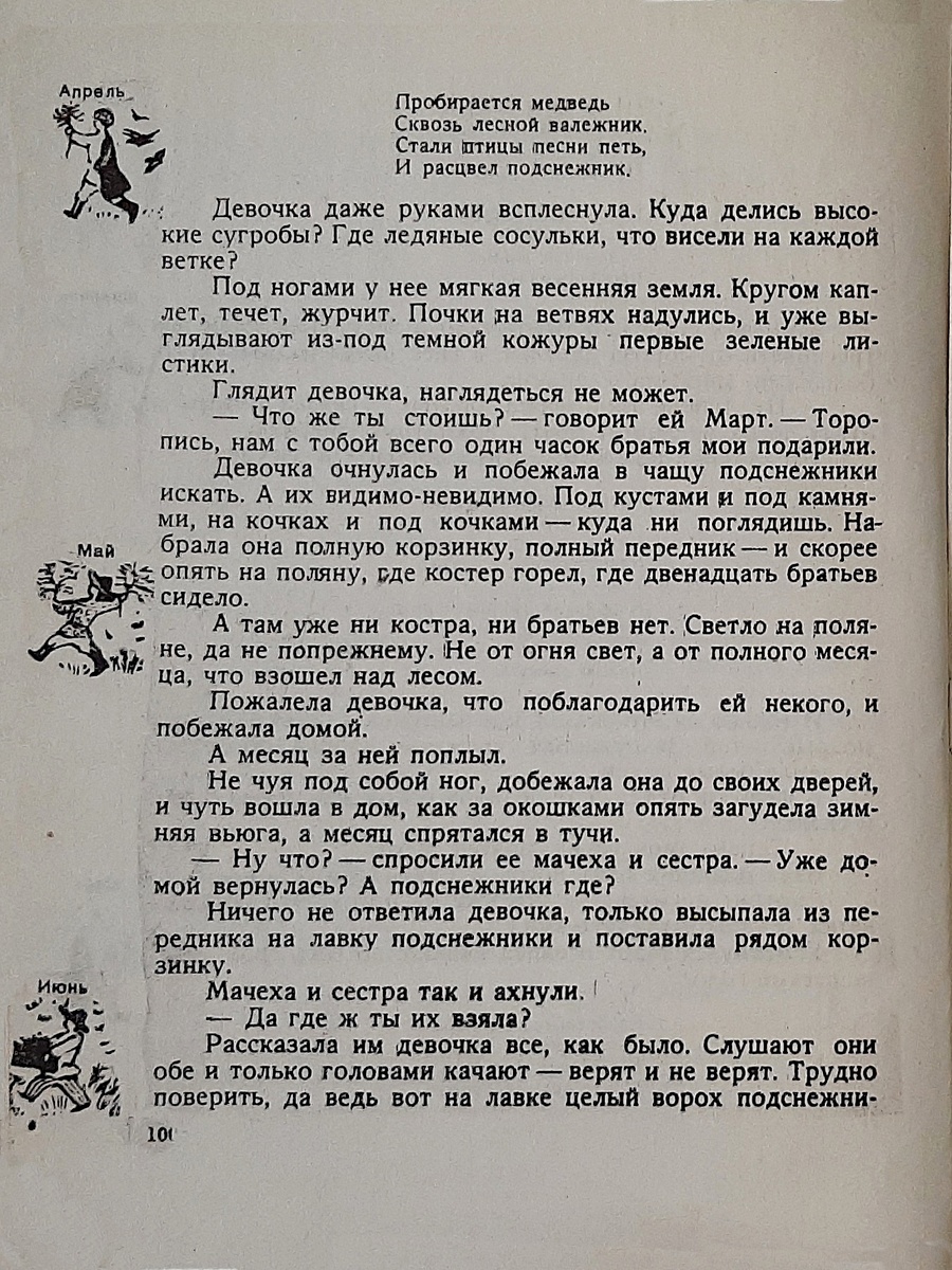 В первый день апреля вспоминается, как недавно природа шутила над нами, превращая январь в март или апрель. Этот каприз природы словно повторял сюжет хорошо всем известной с детства сказки «Двенадцать месяцев» Самуиля Яковлевича Маршака (1867-1964). В нашем фонде хранится сборник сказок, рассказов, стихов и самоделок для детей дошкольного и младшего школьного возраста «Новый год», увидевший свет военной зимой 1942/43 годов, в котором сказка Маршака опубликована впервые. Это был прозаический вариант волшебной сказки. Маршак адаптировал богемскую или чешскую народную сказку для советских читателей. Записала сказку известная чешская писательница, фольклорист Божена Немцова (1820-1862) и опубликовала на чешском языке еще в 1857-1858 гг. в сборнике «Словацкие сказки». В России сюжет был известен под названием «О двенадцати месяцах» с 1862 г. благодаря переводу Н.С. Лескова. Сказки Немцовой и Маршака близки только некоторой общностью сюжета, но отличаются рядом деталей и героев. Маршак работ