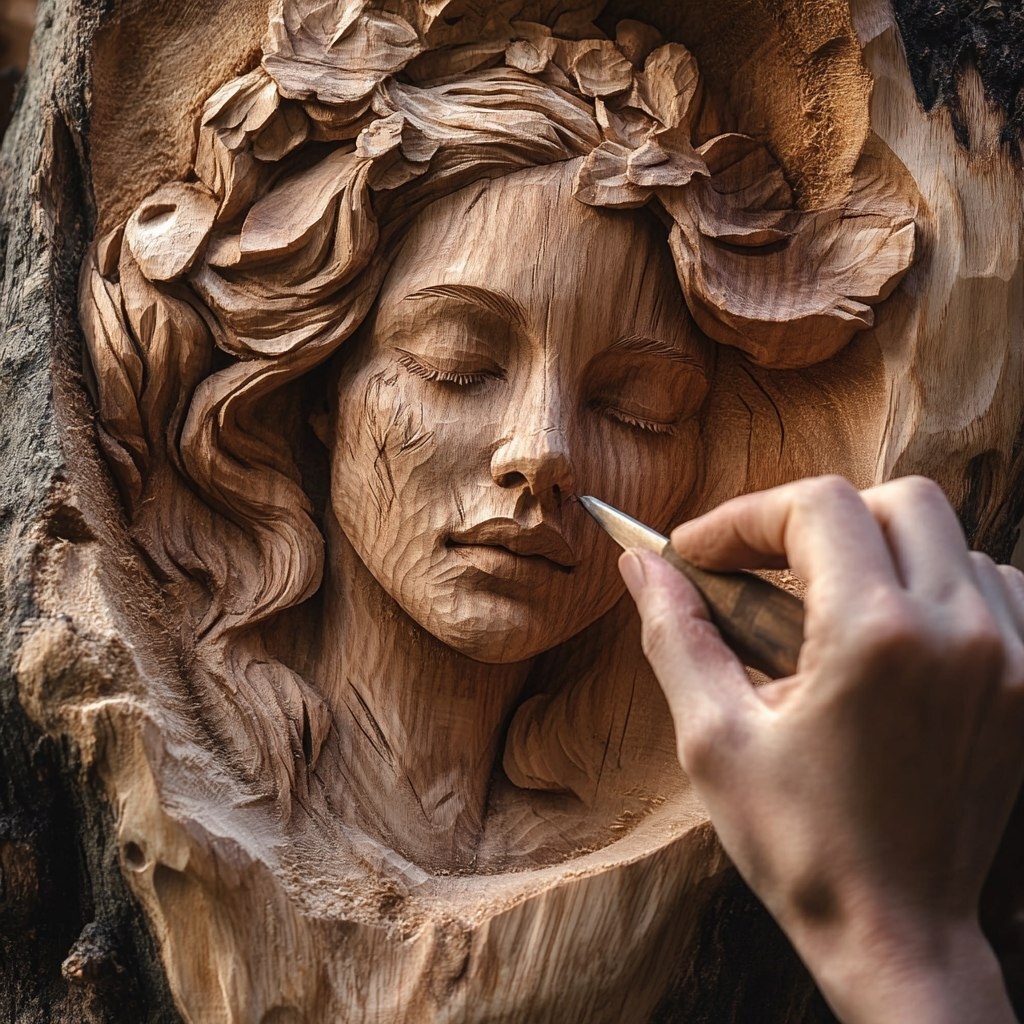Создано на основе запроса: A pair of hands carving a realistic female human figure out of wood with a chisel