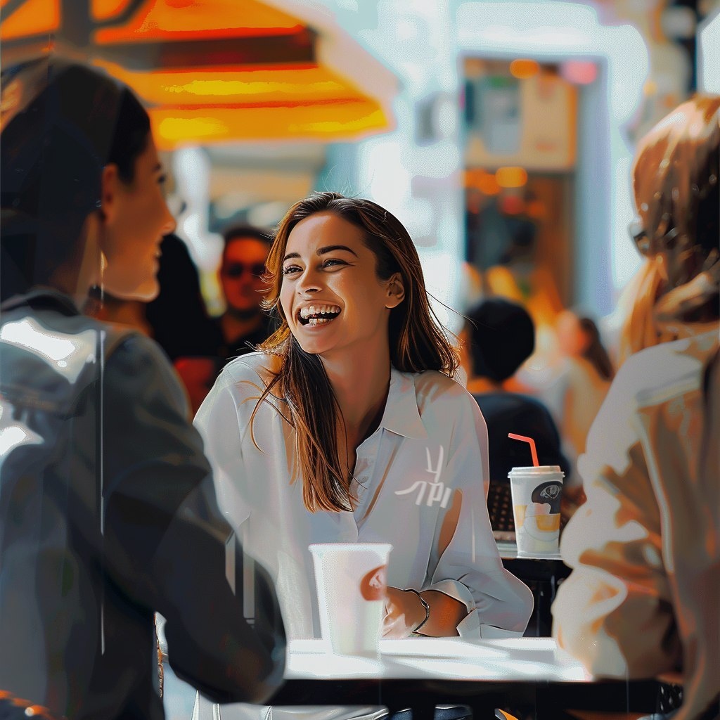 Создано на основе запроса: A woman wearing casual clothes is chatting with friends in a caf é, with a bright smile. The color scheme is bright, with a city street scene as the background, full of vitality.