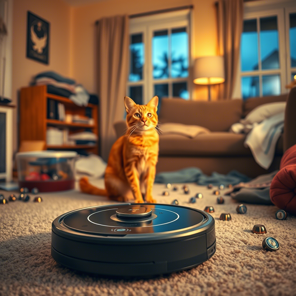 Барсик сначала игнорировал новичка. Но когда Roombаныч впервые прополз под диваном, выгнав оттуда запылившийся мячик, кот встал в позу гладиатора. Он начал охоту: бросался под колеса, шипел на инфракрасные датчики, а однажды умудрился улечься сверху, словно это был трон. Дмитрий смеялся, снимая это на телефон, пока кот не сбросил с полки его коллекцию пивных крышек — прямо на путь пылесоса.