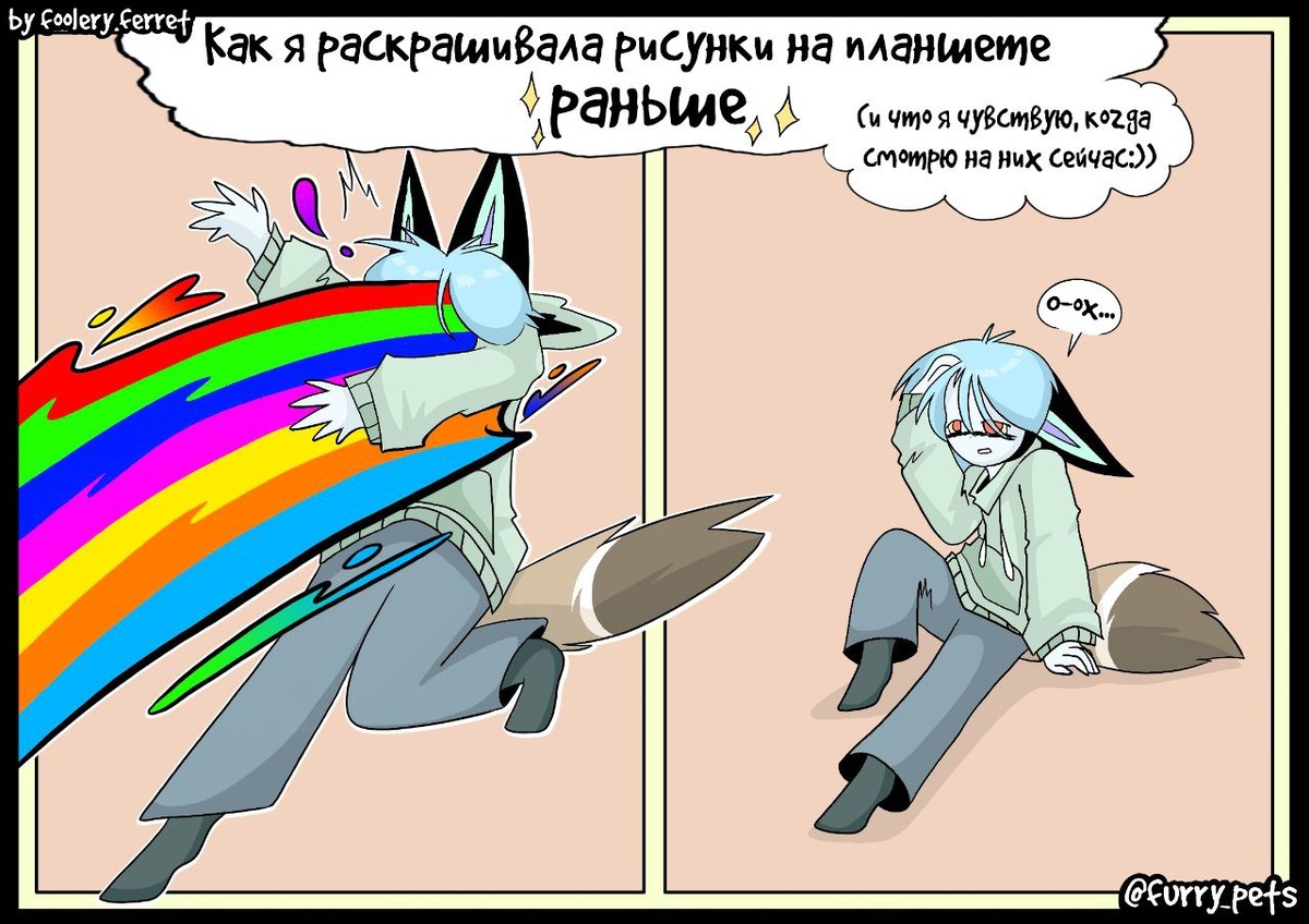 "Яркость в глаза" Ох уж эти цвета...))) Да, я реально помню то, как раскрашивала ещё давно на планшете рисунки ИМЕННО ТАКИМИ цветами. Яркость — наше всё ✨✨✨ Почему-то мне кажется, что комикс получился немного не очень, что ли, ну ладно 🤔