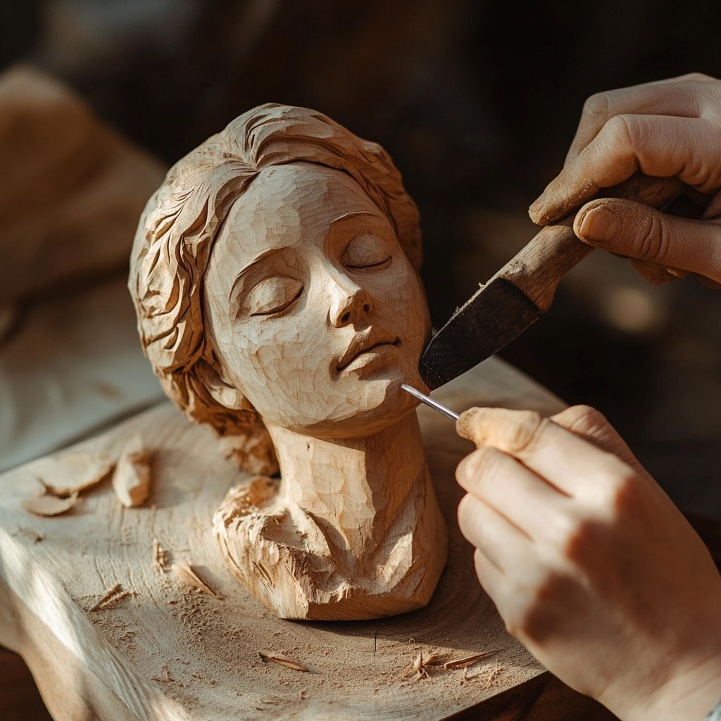 Создано на основе запроса: A pair of hands carving a small realistic female statue out of wood with a chisel. Realistic rustic aesthetic.
