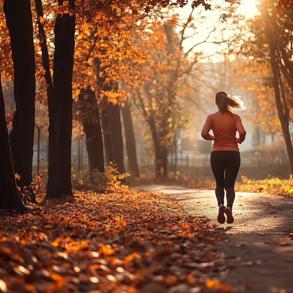Создано на основе запроса: The sunlight shone through the leaves on a woman running in the park in the early morning. She put on sportswear and was full of vitality, with a vibrant orange color scheme