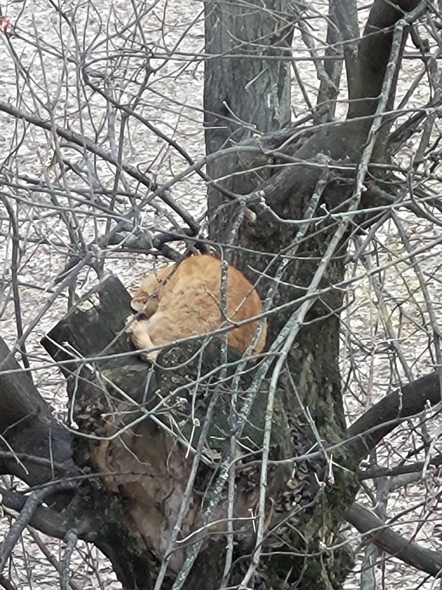 Уверена, что в каждом дворе есть уличные коты. И они очень рьяно охраняют свою территорию. Вот как сбились в стаю, захватили подвал, пометили территорию и все-баста! Чужих не пустят. Плодятся и размножаются со скоростью света. Естественно, жители дома подкармливабт этих названных сожителей. Ну, а как по-другому? Жалко их. Особенно зимой. В нашем дворе тоже проживает такая весёлая семейка. Удивительно, но в этом сообществе есть несколько котов и я ни разу не видела, чтобы они дрались. Такое мирное сосуществование . И есть среди них один молодой котяра. Рыжий, жилистый с наглой мордой-шайбой! И вечно голодный. Кто бы что не принес-несется первым. И ладно бы это. Этот кот облюбовал себе индивидуальные апартаменты-на дереве! Я из окна квартиры сначала подумала, что какой-то пакет лежит. Занесло ветром. Потом присмотрелась.. Кот! Стала замечать, что по вечерам он туда залезает и прекрасно проводит ночь не брясь угрозы от собак или крыс. Утром благополучно спускается на трапезу и про