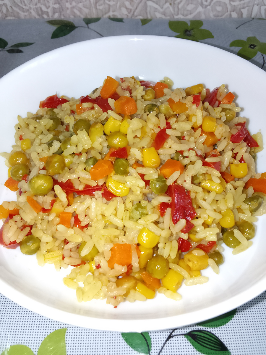 Можно готовить как самостоятельное блюдо, так и как гарнир. Ингредиенты: Сначала морковь режу мелким кубиком и отправляю её на сковородку. Жарю на растительном масле на среднем огне 5 минут. К моркови добавляю горошек, жарю 5 минут. . После отправляю на сковороду кукурузу без жидкости и порезанный кубиком перец , также жарю 5 минут. . Теперь высыпаю промытый рис, солю, перчу и вливаю 2 стакана воды. Тушу на медленном огне до готовности риса. . Приятного аппетита!