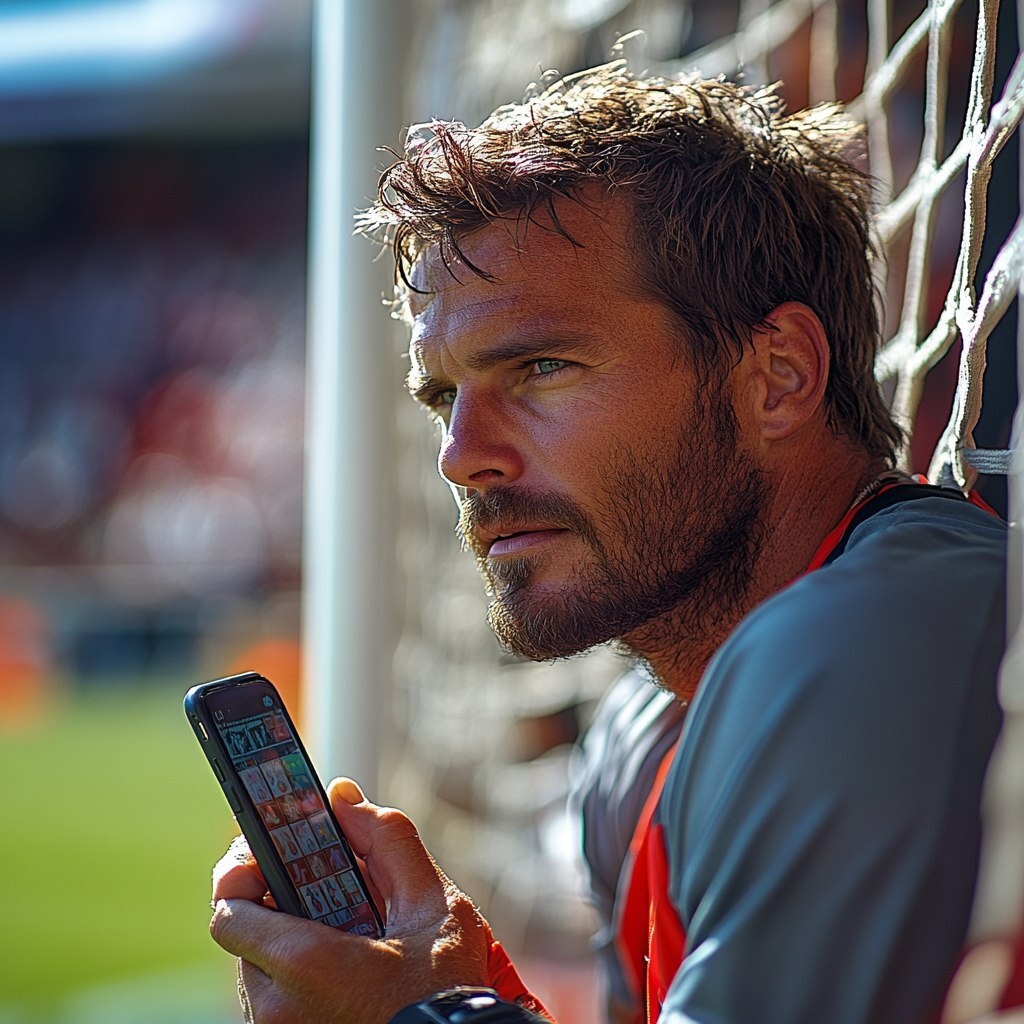 Создано на основе запроса: a soccergame, the keeper stands at one corner of the goal and focuses on his mobilephone