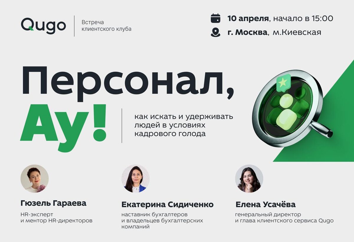 На следующей неделе участвую в офлайн-встрече клиентского клуба Кьюго! Тема не новая, но очень горячая: Как искать и удерживать людей в ситуации кадрового голода. 📆 Дата и время: 10 апреля в 15:00, 📍 Место: рядом с м. Киевская (точный адрес вышлют после регистрации) Решение проблемы кадрового голода рассмотрим с трех стратегических позиций: HR-директора, главного бухгалтера и собственника бизнеса. Что ждёт участников: ⚡️ Выступления экспертов ⚡️ Нетворкинг ⚡️ Живая дискуссия ⚡️ Кейтеринг и изысканные напитки ⚡️ Бесплатная парковка А также обсуждение вопросов о возможностях работы с внештатниками. Как попасть на мероприятие, если вы не клиент Qugo? ⤵️ Пройдите регистрацию и дождитесь звонка от менеджера. Количество мест ограничено.