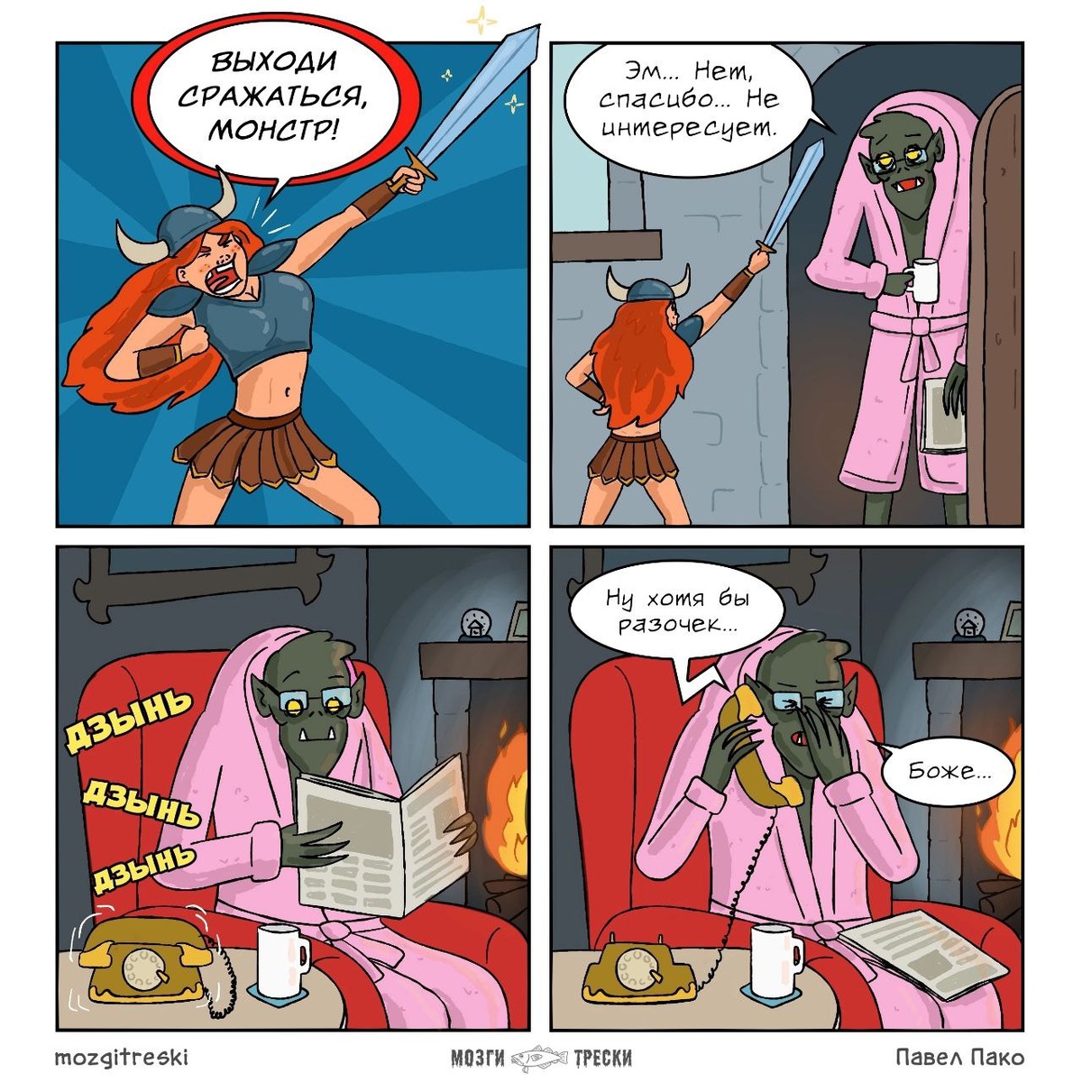 Несмотря на то, что сюжеты про отношения и домашних животных все еще занимают собой очень большой сегмент юмористических веб-комиксов, некоторые другие темы тоже остаются очень даже популярными. К примеру, я уже давненько заметил, что довольно легко собирать подборки с комиксами в сеттинге фэнтези - таких зарисовок в сети полно и постоянно появляются новые, так что отобрать очередную десятку сюжетов для статьи проще простого. Но самое главное, что читателям такое нравится, так что почему бы не сделать еще одну такое статью? Вот я и сделал. Начну я, пожалуй, со своего собственного комикса - недавно для серии Мозги трески я рисовал сюжет о воительнице, которая решила сразиться с монстром. Правда, оказалось, что с этим могут возникнуть проблемы. Большинство комиксов автора паблика ceSar art посвящено разным отважным героям и мифическим существам, так что работы этого художника очень часто попадают в подобные подборки. Один из недавних комиксов, к примеру, был посвящен встрече одной эльфий