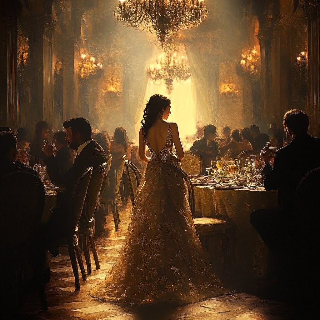 Создано на основе запроса: In the magnificent banquet hall, a woman dressed in a gorgeous evening gown became the center of attention during