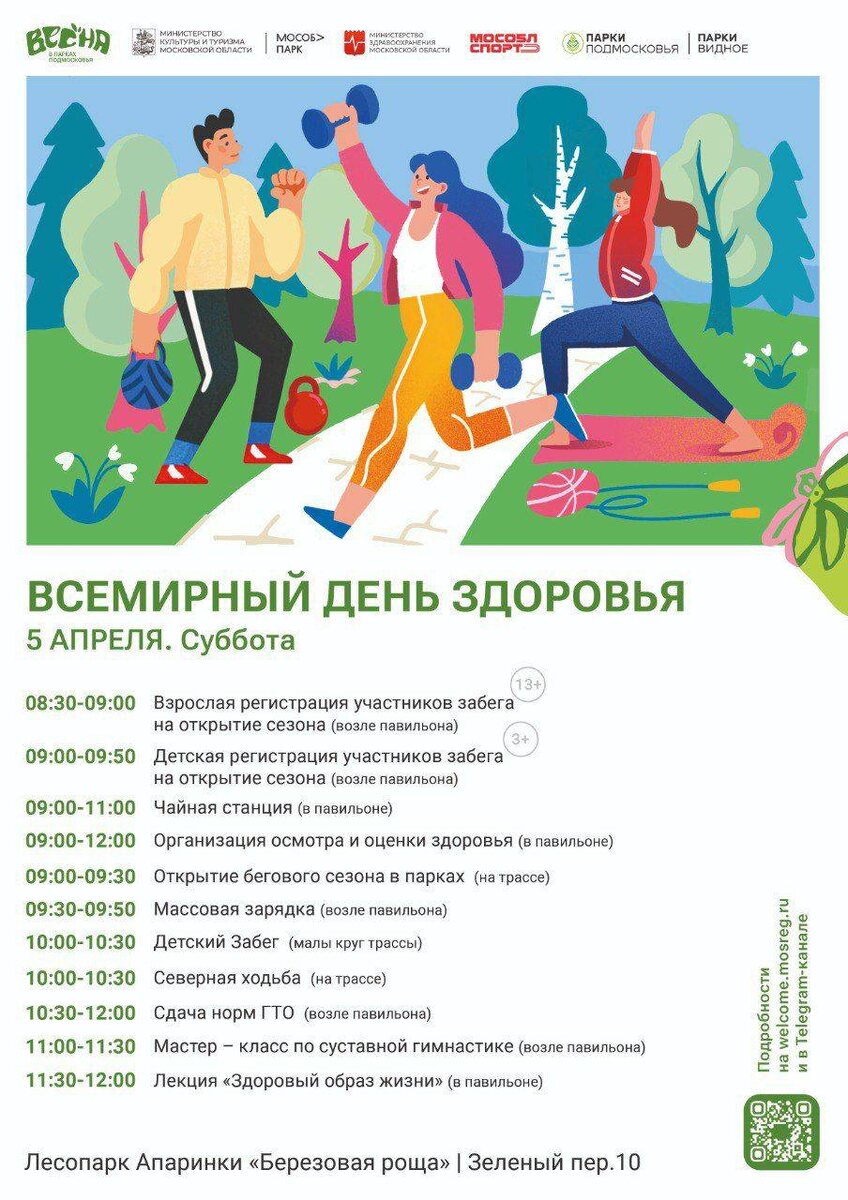 Приглашаем всех на спортивный праздник, посвященный Всемирному дню здоровья 🗓 05 апреля ⏰ 09.00 - 12.00 📍 парк Апаринки г.Видное В программе: ✅ сдача норм ГТО ✅ взрослый и детский забеги ✅ осмотр и оценка здоровья от Видновской РКБ ✅ массовая зарядка ✅ проход северной ходьбы с участниками клуба "Активное долголетие" ✅ мастер-класс по суставной гимнастике ✅ лекция "Здоровый образ жизни" ✅ чайная станция Приходите всей семьёй! Будет интересно! 💕