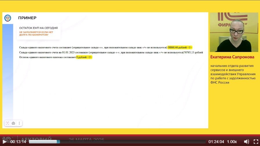 ‼️Пример справки при наличии задолженности по банкротству показала Екатерина Сапронова, эксперт 1С в лектории на тему Новая справка о сальдо ЕНС: основные изменения и ответы на часто задаваемые вопросы Также были рассмотрены примеры: 00:13:12 Пример справки при отсутствии долга по банкротству 00:15:11 Пример детализации отрицательного сальдо 00:19:37 Пример. Информация о суммах формирования предстоящей обязанности 00:22:36 Пример. Детализация расчета суммы начисления/уменьшения пени Отзыв слушателя: Лектор подробно и доступно рассказала о новой форме справки, разделах и возможностях формирования запроса. В презентации были ссылки на предыдущие нормы законодательства по расчету пеней, что было полезно для создания полноты картины. Благодарю. 👉Смотрите полную видеозапись лекции бесплатно! 🚨Подписывайтесь на @lector_1c