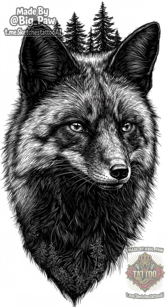 #2194 Подборка по запросу подписчика - добрая морда чёрной лисы. Можно с фоном леса или без. А также по возможности - тело черной лисы с мордой в анфас. Возможно лисёнок черный рядом. Рассмотрю варианты. 🧠 SYNTX 💳 Донат 😎 НейроБро 💀 Эскизы от нейросети #лиса #животные #природа #эскизы #тату #татуировки