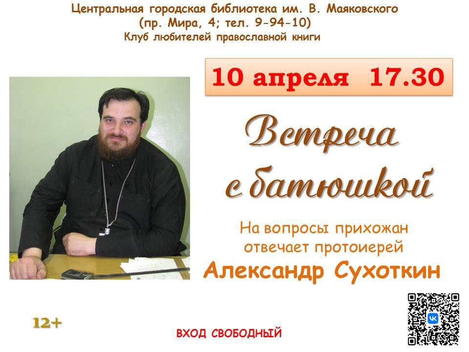 10 апреля библиотека им. В. Маяковского и Клуб любителей православной книги приглашают горожан на встречу с помощником благочинного Саровского округа по культуре протоиереем Александром Сухоткиным.