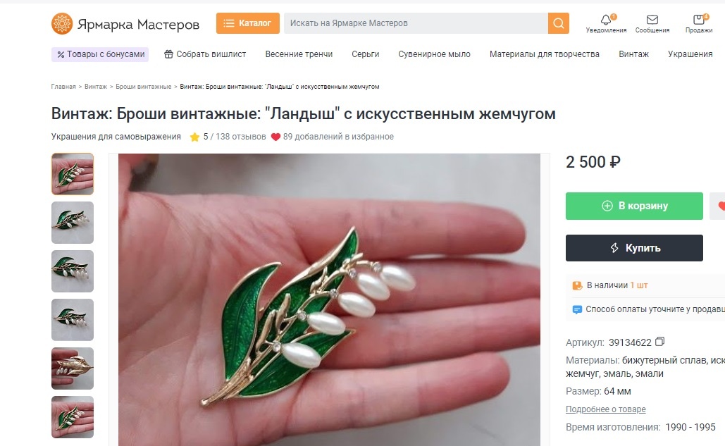 В продаже броши в виде ландышей. В описании продавец дает информацию - "Крупные, броские броши Ландыши. Состояние идеальное, не носились".