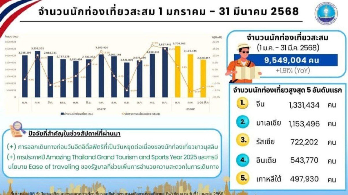 В первом квартале 2025 года Таиланд посетили 9,5 млн иностранных туристов