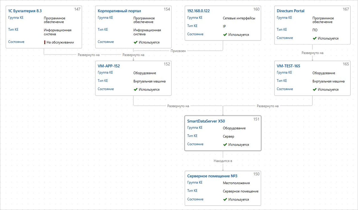 В блоках отображаются элементы инфраструктуры, а стрелками и линиями показано, как они связаны между собой. Например, если рассмотреть блок из карты выше с наименованием SmartDataServer X50, то видно, что эта конфигурация расположена в серверном помещении № 3. На сервере развернуты две виртуальные машины VM-APP-152 и VM-TEST-165, а на них в свою очередь 1С: Бухгалтерия, корпоративный портал и сетевой интерфейс.