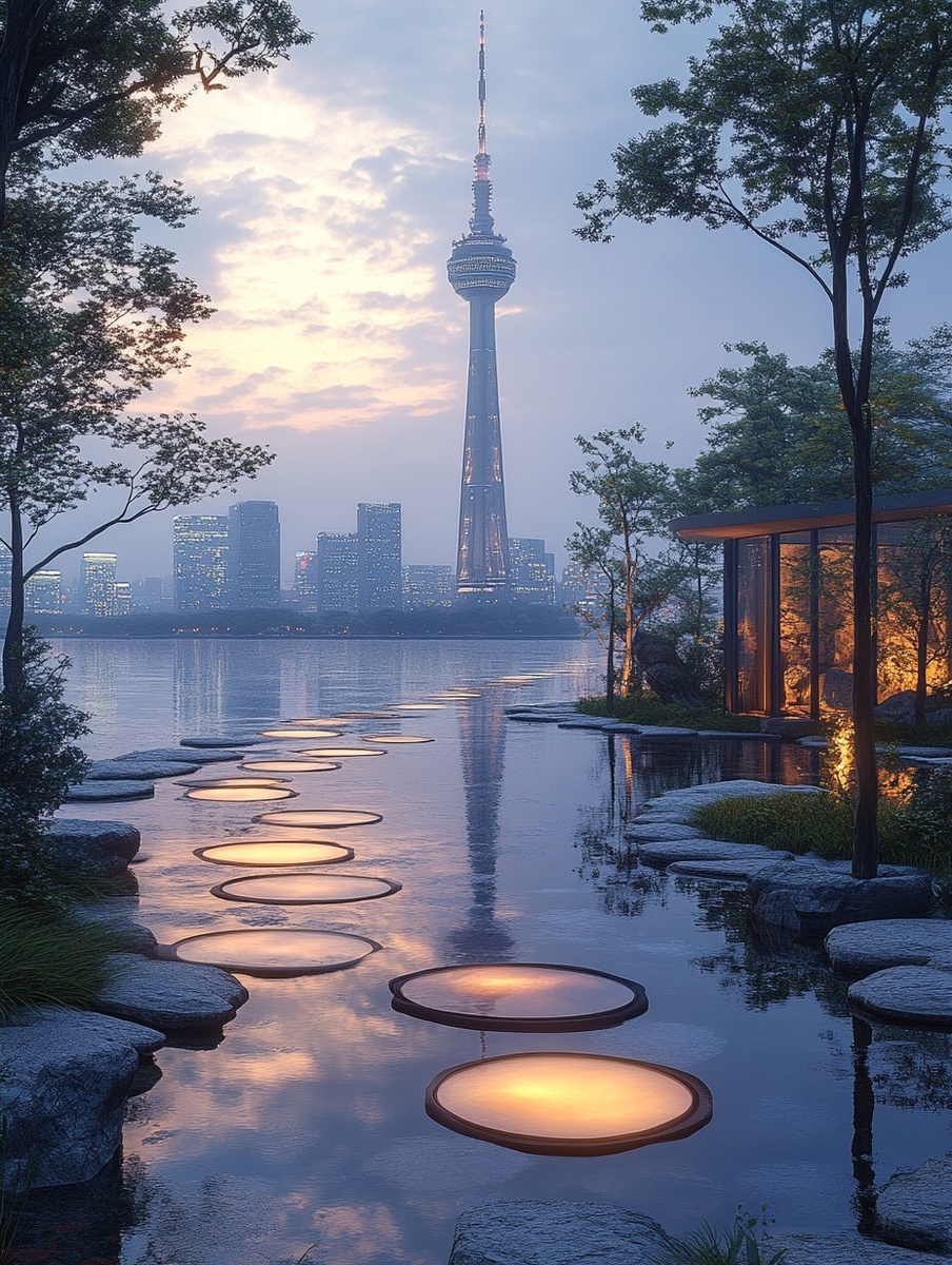 Создано на основе запроса: the Oriental Pearl Tower,clouds and ponds, with a surreal 3D landscape style,oval entrance, soft color landscape