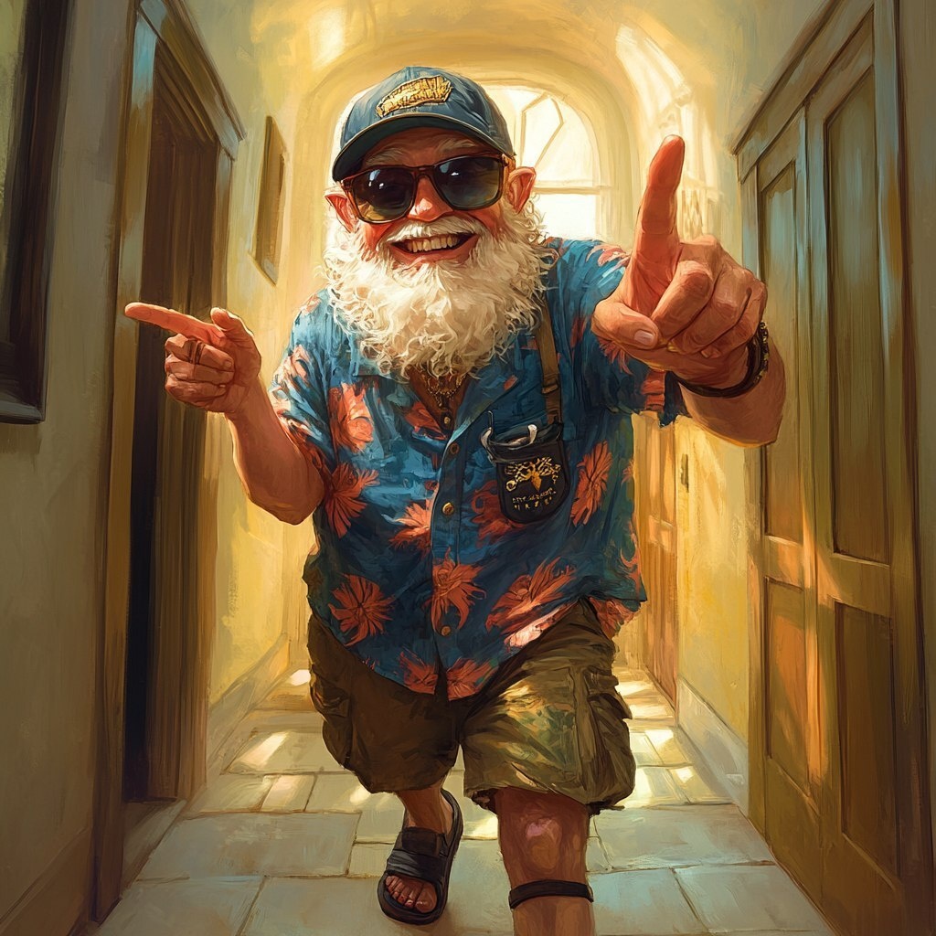 Создано на основе запроса: dunegons and dragons style artwork of a short wizard with a white beard wearing sunglasses, a blue hawaiin shirt, a sideways baseball cap, and cargo shorts, smiling and pointing their fingers towards the viewer in a cool way, in a hallway with natural lighting. Cheerful, fun, laid-back