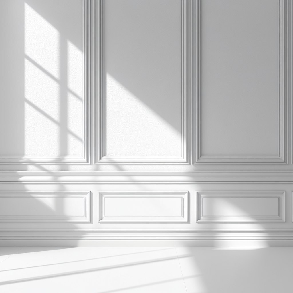 Создано на основе запроса: white wall, plain wall with classic cornices and skirtings, , white matte floor, sunshine shadows, empty space
