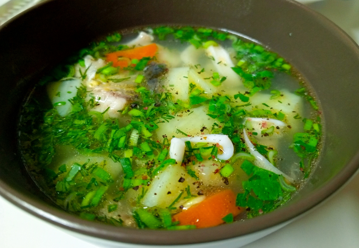 Значит, варим бульон из голов и всякой рыбы на кости. Какую любите, ту и берите. Лук головку не забудьте положить, какие-то коренья, если желаете. Долго варить не надо, минут 30-40 достаточно. Потом процеживаем наш бульон и добавляем картофель. Десять минут и кладём филе рыбы. Можно треску, окуня, красной какой-нибудь. И ещё свежих кальмаров кольцами, очень они там к месту. Безусловно, не забываем лавровый лист. А зелень и молотый в ступке перчик, у меня их четыре, - при подаче.