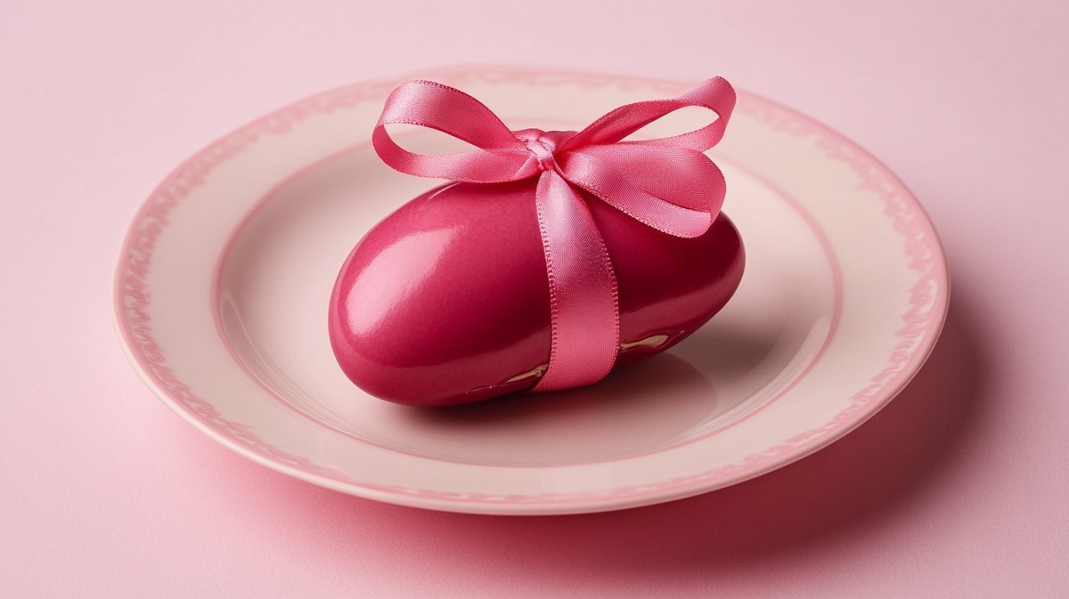 Создано на основе запроса: a large pink bean tied to a plate on a pink background tied with a pink ribbon as if it were a gift
