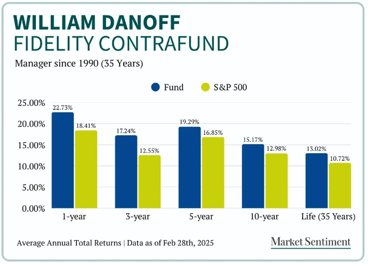 Уильям Данофф превзошел S&P 500 практически за все мыслимые периоды времени - 3, 5, 10, 20, 25 и даже 34 года. С 1990 года он единолично управляет фондом Fidelity Contrafund - впечатляющий подвиг, учитывая, что его активы под управлением составляют более 150 миллиардов долларов. Ни один другой взаимный фонд такого размера не управляется одним человеком.
