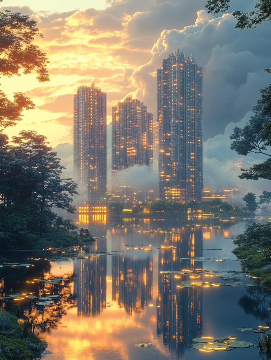 Создано на основе запроса: city view, mordern skyscrapers, clouds and ponds, with a surreal 3D landscape style, soft color landscape