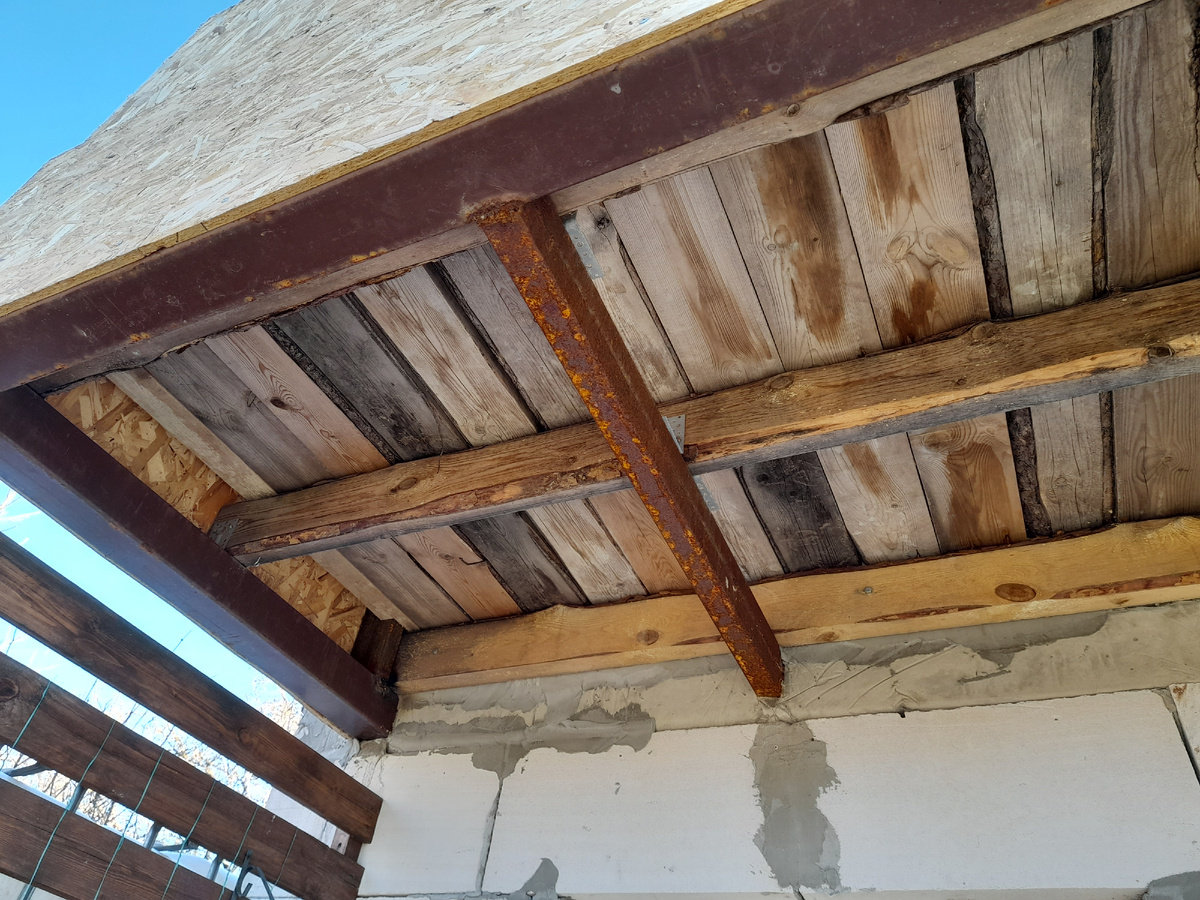 Балкон полностью доделан, осталось утеплить его пол. Утеплять решили со стороны улицы. Ведь пол балкона является также и потолком беседки. Уложили утеплитель толщиной 20 см. Закрыли пароизоляцией и стали крепить имитацию бруса. Доски я красила заранее. Получилось очень хорошо. Теперь в беседке приятно сидеть, а когда отделаем стены дома, будет еще лучше.