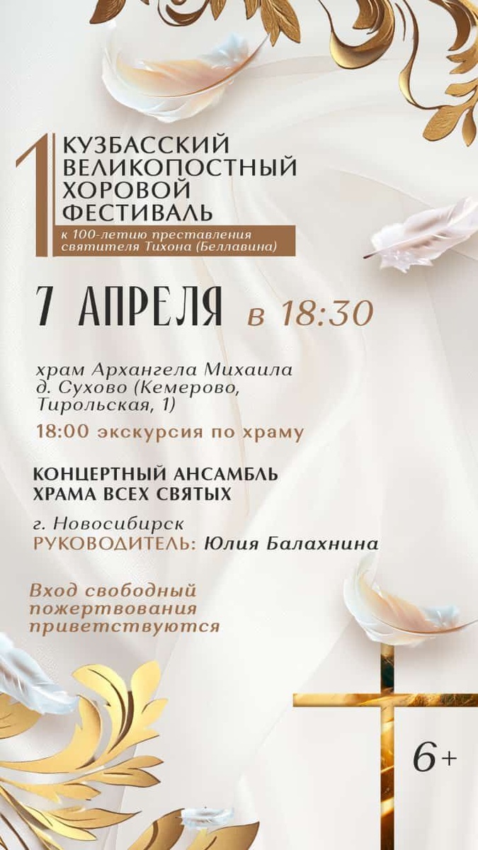 Дорогие братья и сестры! Ещё одно объявление о мероприятии в г. Кемерово. По благословению митрополита Аристарха у нас в городе будет проходить первый Кузбасский великопостный хоровой фестиваль, на который приглашаются все желающие. Прикрепляю афиши на каждый день фестиваля. Концерты будут проходить три дня: 7, 8 и 10 апреля. Вход свободный. 7 апреля - в храме Архангела Михаила с. Сухово (чуть дальше Троицкого храма по проспекту Химиков); 8 апреля - в храме Казанской иконы Божией Матери; 10 апреля - в филиале Центральной музыкальной школе-Академии исполнительского искусства "Сибирский", по адресу ул. Ворошилова, 22 Б. Организаторы фестиваля обращают внимание на то, что филиал Центральной музыкальной школы - режимный объект, и поэтому проход на концерт осуществляется через проходную. Для прохода - необходимо обязательно заранее зарегистрироваться - пройти по ссылке, и вписать своё имя https://forms.yandex.ru/u/67d796b784227cff19bd7eee/ Желательно сделать это до 7 апреля, до 12:0