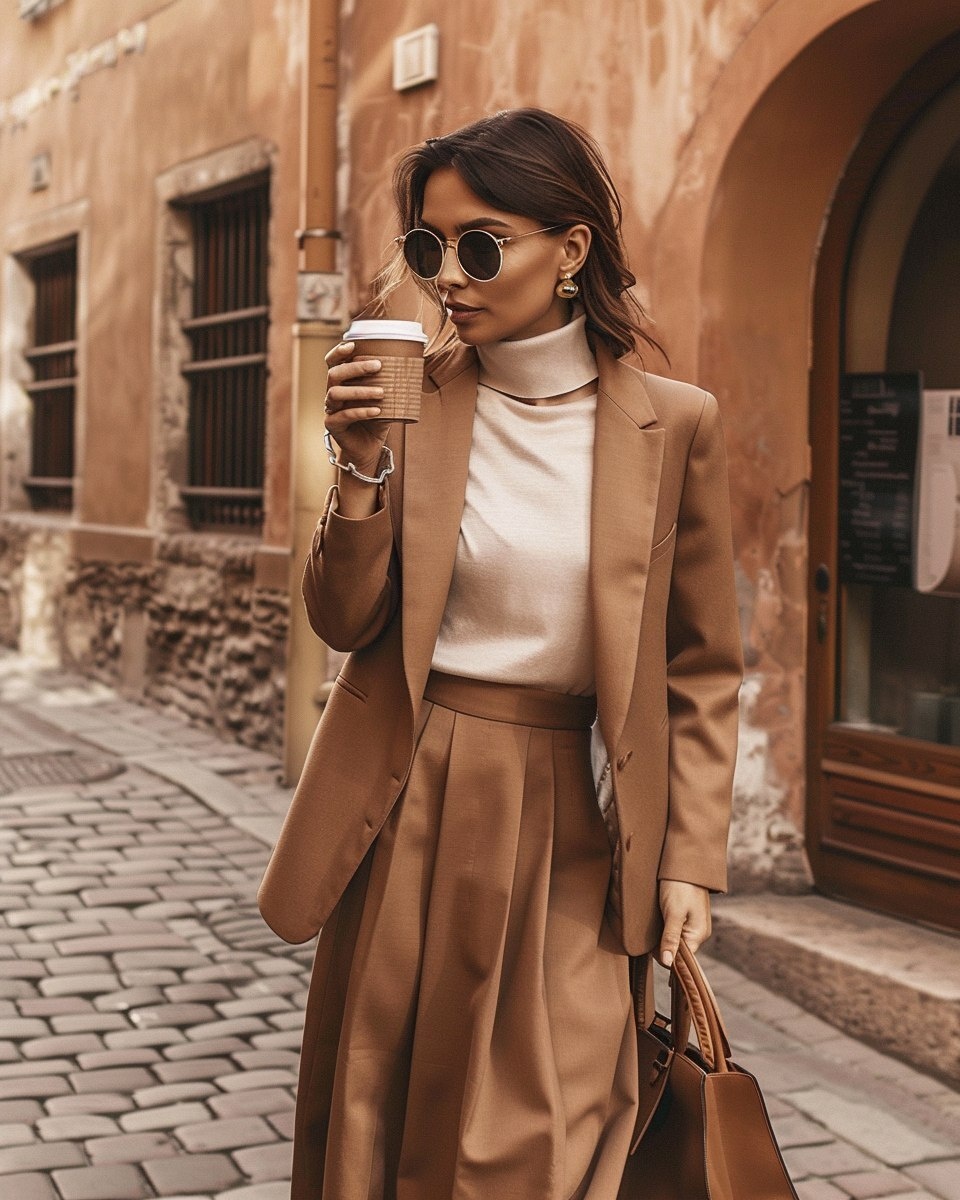 Создано на основе запроса: A sophisticated French woman wearing a tailored suit, off-white silk turtleneck and coffee-brown midi A-line