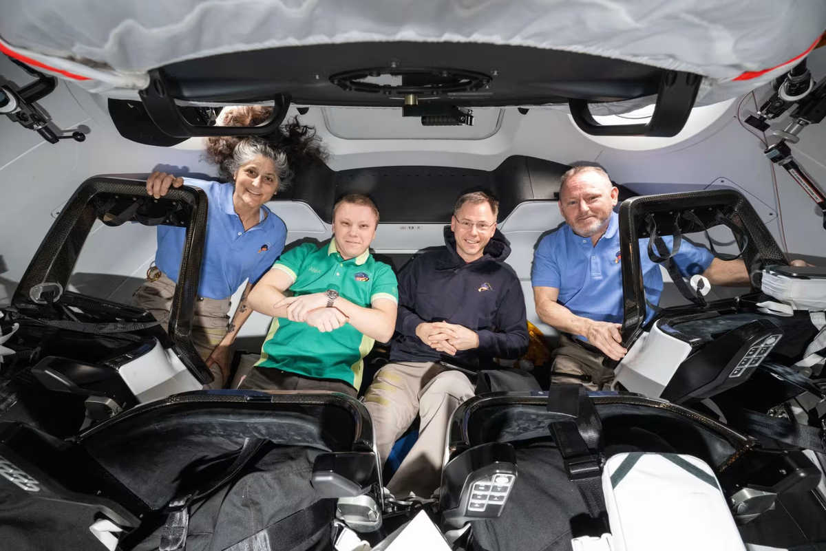 ФОТО: Члены экипажа NASA SpaceX Crew-9 Суни Уильямс, Александр Горбунов, Ник Хейг и Буч Уилмор в космическом корабле SpaceX Dragon, пристыкованном к Международной космической станции. (NASA)