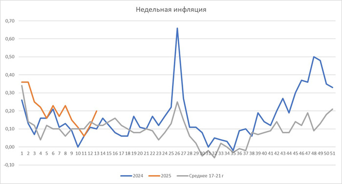 Цены на продовольственные товары растут (основной драйвер). Недельная инфляция продолжила ускорение. С 25 по 31 марта она составила 0,2% против 0,12% в прошлом отчетном периоде, годовая инфляция подросла с 10,2% до 10,24%. с 25.03 по 31.03 0,20%с 18.03 по 24.03 0,12%с 11.03 по 17.03 0,06%с 04.03 по 10.03 0,11%с 25.02 по 03.03 0,15%с 18.02 по 24.02 0,23%с 11.02 по 17.02 0,17%с 04.02 по 10.02 0,23%с 28.01 по 03.02 0,16%с 21.01 по 27.01 0,22%с 14.01 по 20.01 0,25%с 1.01 по 13.01 0,67% На этом фоне, первоапрельское заявление (https://t.me/dividendo/1857) советника председателя ЦБ смотрится ещё юморнее. Но прозвучали и другие заявления: "На ближайшем заседании мы будем рассматривать все поступившие данные и оценивать целесообразность дальнейших действий. Мы не исключаем того, что может потребоваться дополнительное повышение ставки, если не на следующем заседании, то в дальнейшем, если замедление инфляции будет происходить не теми темпами, которые предполагает наш прогноз 7-8% на этот год и