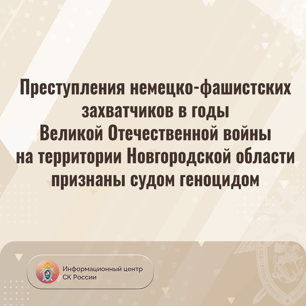 Преступления немецко-фашистских захватчиков и их пособников в годы Великой Отечественной войны на территории современной Новгородской области признаны судом геноцидом народов СССР. Наряду с другими материалами, в основе решения – доказательства, собранные Следственным комитетом России в рамках расследования уголовного дела о целенаправленном массовом уничтожении мирного населения и военнослужащих на оккупированной территории Советского союза.
