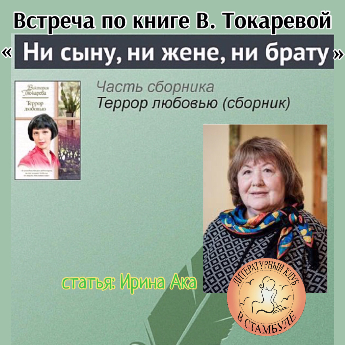 В феврале в «Литературном Клубе в Стамбуле» мы обсуждали рассказ-повесть Виктории Самойловны Токаревой «Ни сыну, ни жене, ни брату».