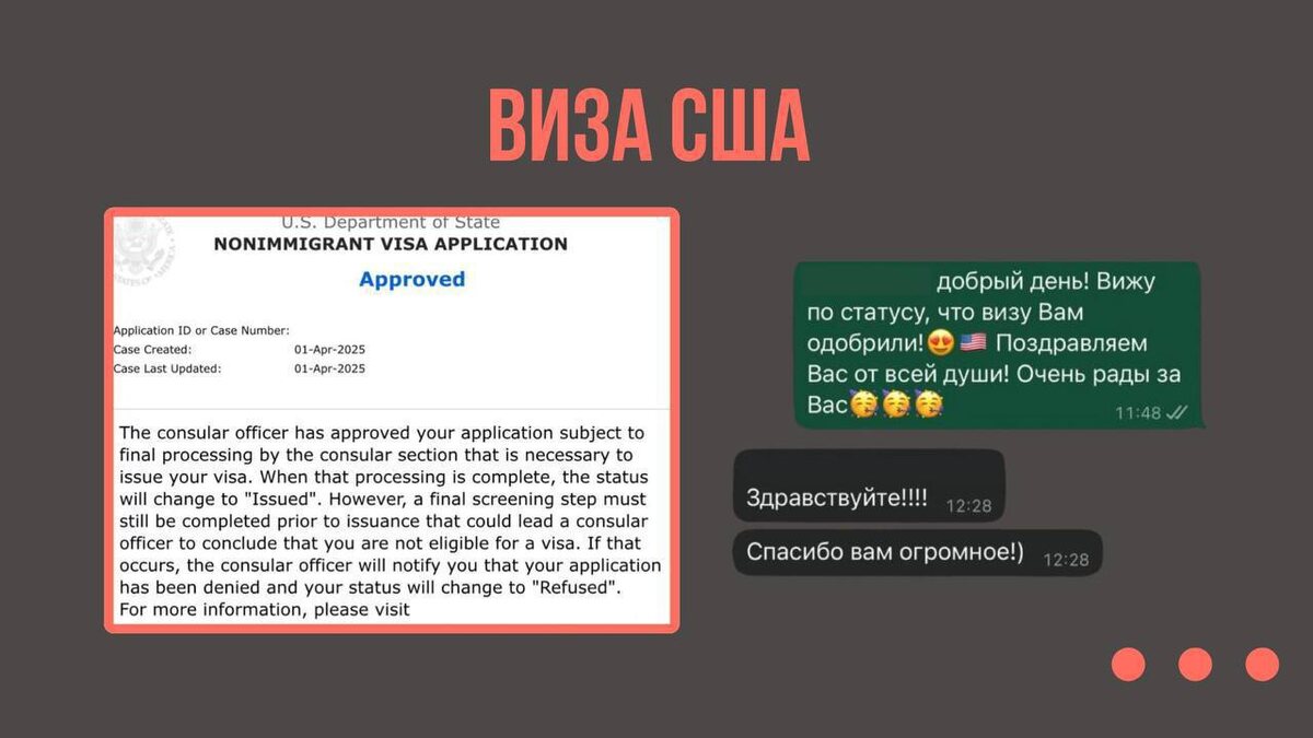 Виза США 🇺🇸 1 апреля была одобрена первичная виза США гражданке РФ. Кейс: девушка, состоит в браке. Есть свой бизнес по производству и продаже одежды на маркетплейсах. Запланирована поездка к сестре, которая находится в ожидании Green Card по статусу political asylum. За последние 5 лет была посещена только 1 безвизовая страна. Собеседование проходило с переводчиком. Вопросы консула: — Какая цель вашей поездки? — Как ваша сестра оказалась в США? — Кем вы работаете? — Сколько лет вашему бизнесу? После ответов на вопросы консул одобрил визу США! 🇺🇸 Получить визу США ⬅️ Записаться на консультацию ⬅️ #кейс #виза_США