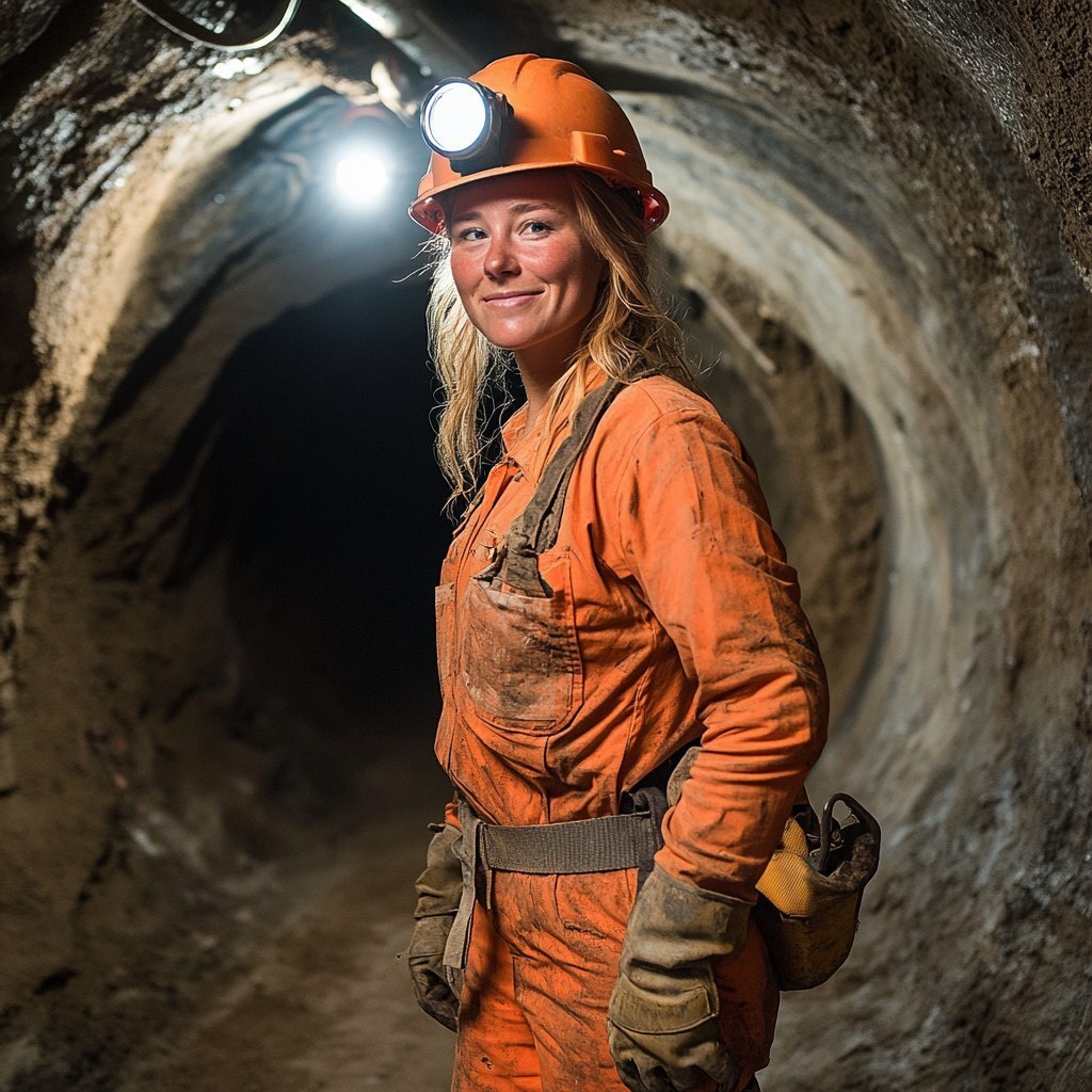 Создано на основе запроса: A photograph of an American woman wearing orange workwear and a hard hat with a flashlight on her head, standing inside a dirt tunnel underground and looking at the camera with a smile. 3:4 --- Автоперевод: Фотография американской женщины, одетой в апельсиновую рабочую одежду и каску с фонариком на голове, стоящая в грязном туннеле и с улыбкой, глядя на камеру. Интересно получилось? 🤔 https://dzen.ru/id/65c0c65c86e4f837c27b24d7 #ИИ #AI #нейросеть #midjourney #art