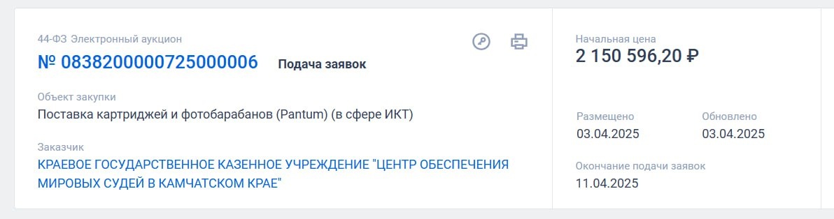 💼 Объявлен тендер в Камчатском крае на Поставка картриджей и фотобарабанов (Pantum) (в сфере ИКТ