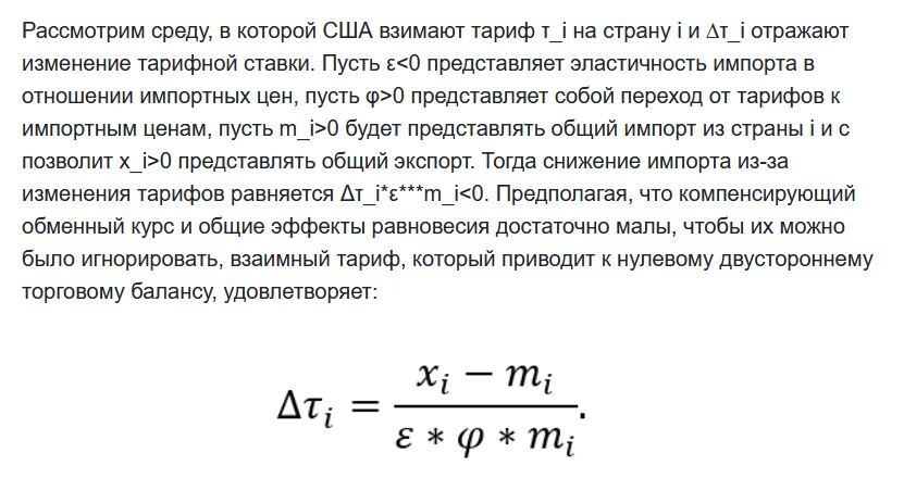 Они не считают конкретные тарифы отдельных стран и не учитывают конкретные торговые ограничения и преференции. Это слишком сложно, «если не невозможно» (по их собственному мнению). Они пошли по простому пути. Написали формулу, согласно которой ставка импортного тарифа США рассчитывается как функция от величины торгового дефицита с данной страной. Исходя из того, что торговый дефицит с помощью ставки должен быть сведен к нулю.