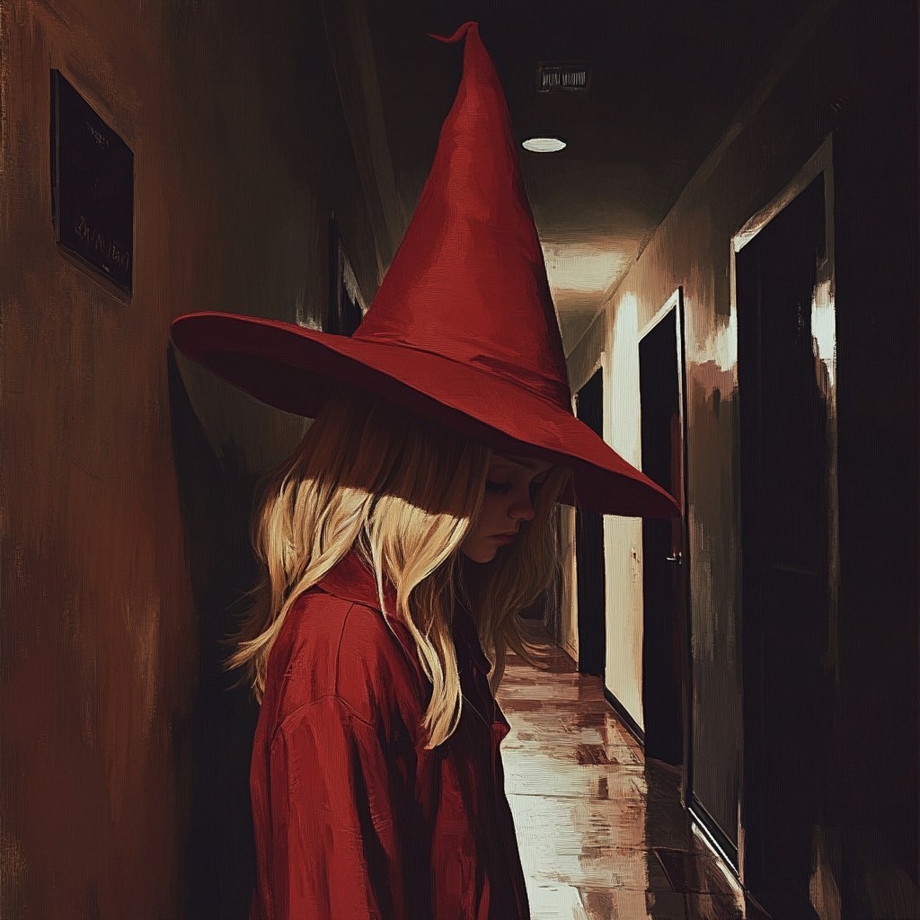 Создано на основе запроса: dungeons and dragons style artwork of a 12-year-old blonde girl wearing a red witches hat, with her head tilted downwards and shadows obscuring her eyes, wearing a red robe, standing at the end of a dark hallway in an office --- Автоперевод: Подземелья и драконы в стиле 12-летней белокурой девушки, одетой в красную шляпу ведьм, а голова наклонилась вниз, а тени скрывают ее глаза, одетая в красную одежду, стоящую в конце темного коридора в офисе Отлично получилось? 🤔 https://dzen.ru/id/65c0c65c86e4f837c27b24d7 #ИИ #AI #нейросеть #midjourney #art